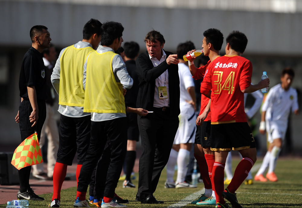 ↑2013年4月13日,時任深圳紅鉆隊法國主教練特魯西埃(中)在2013/2014賽季中國足球甲級聯(lián)賽第五輪中布置戰(zhàn)術。