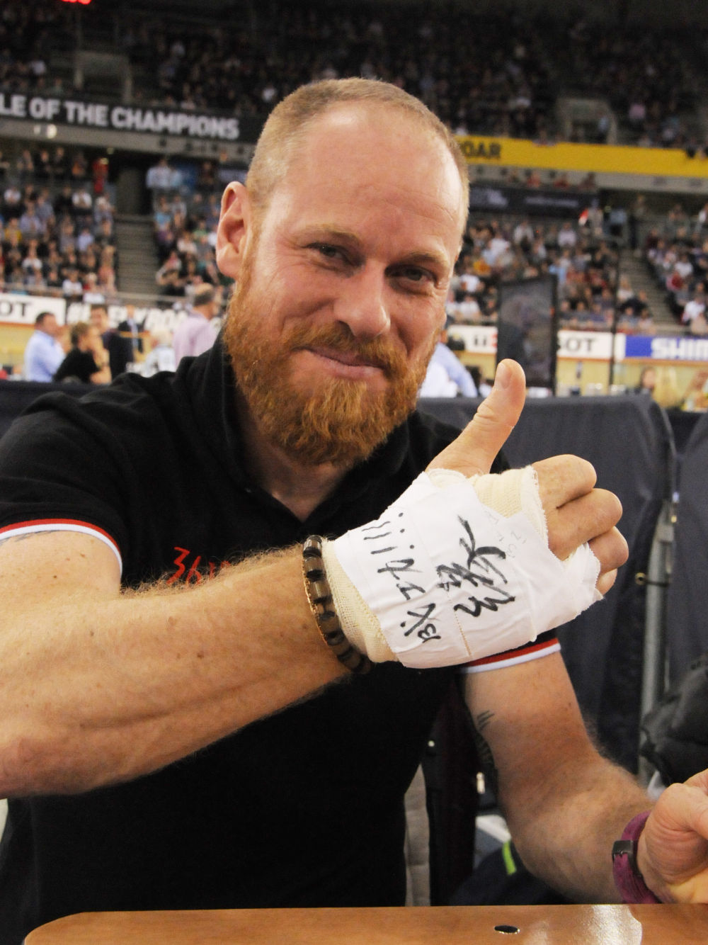 ↑2016年3月6日,2016場地自行車世錦賽賽場上,中國隊的法國籍教練韋蒂展示右手繃帶上的漢字“成功!?。【墶?。