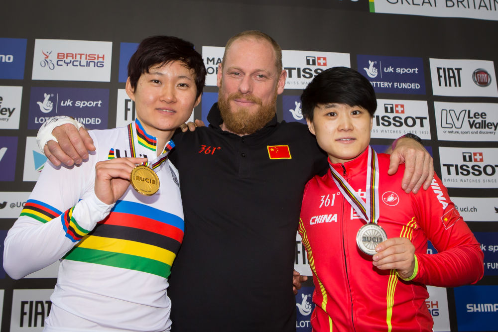↑2016年3月6日,中國隊選手鐘天使(左)、鐘俊紅(右)在2016場地自行車世錦賽女子競速賽決賽后與法國籍教練伯努瓦·韋蒂合影。