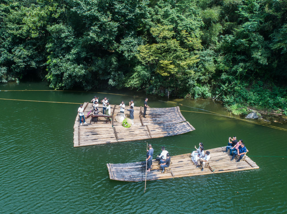 在杭州余杭區(qū)中泰街道,演奏者在竹排上演奏竹笛(資料照片)。 新華社記者 徐昱 攝