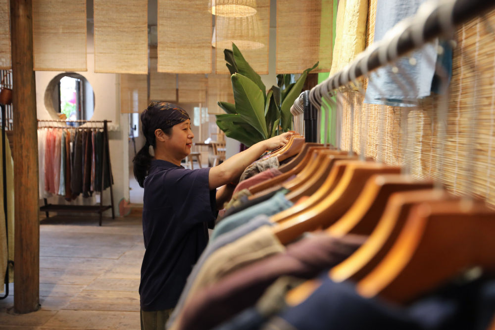 2023年5月23日,在浙江省義烏市李祖村,“農創(chuàng)客”鮑麗萍在店鋪里整理服裝產品。 新華社記者 杜瀟逸 攝