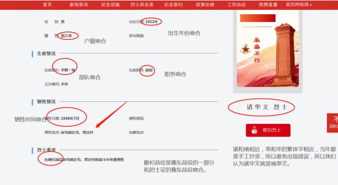 基本信息中,諸華文的出生年份、戶籍、生前情況和犧牲情況都與褚萃文吻合;姓名方面,“諸”與“褚”偏旁相似,而華的繁體寫法(華)與萃也有些相似,可能是登記時(shí)出現(xiàn)了錯(cuò)誤。