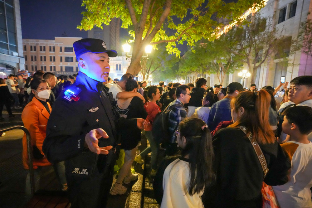5月3日,公安人員在哈爾濱中央大街上維持秩序。