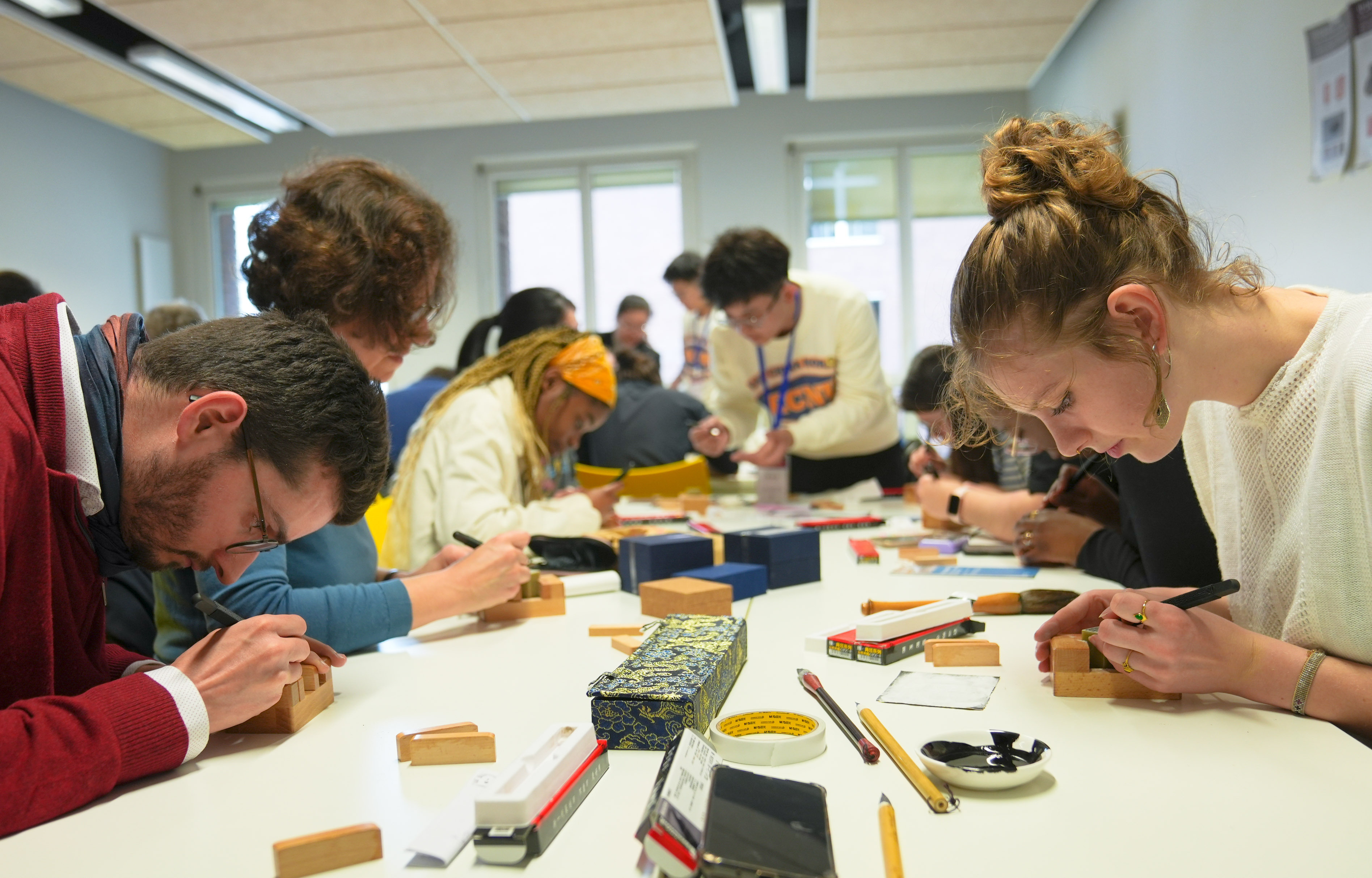 5月2日至5月6日,華東師大“漢字走進法國校園”工作坊活動在新里昂中法大學、熱納斯鎮(zhèn)路易·萊普林斯—林蓋中學、里昂二大與里昂國際學校相繼舉行。當?shù)卮笾行W生和市民參觀了由華東師大美術學院書法篆刻專業(yè)4位老師和43位在校研究生創(chuàng)作的書法篆刻作品,首次動手體驗了篆刻的樂趣。