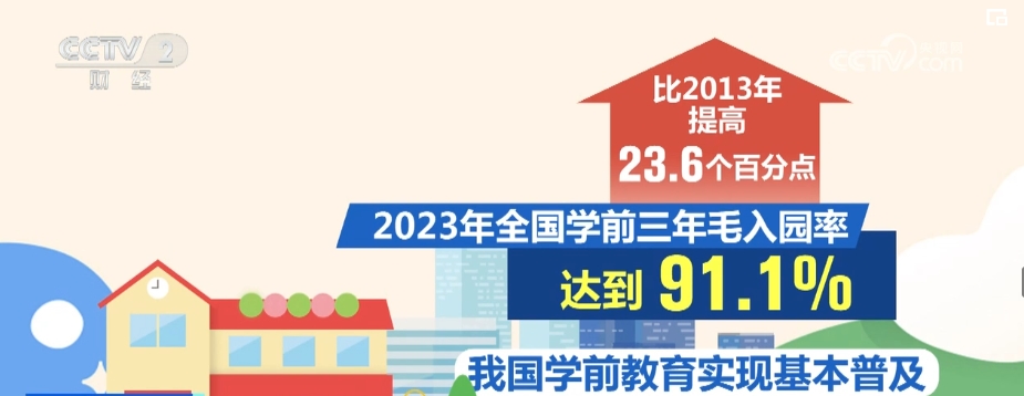據(jù)介紹,截至2023年,全國幼兒園數(shù)量達(dá)到27.4萬所,2023年全國學(xué)前三年毛入園率達(dá)到91.1%,比2013年提高了23.6個百分點,我國學(xué)前教育實現(xiàn)基本普及。
