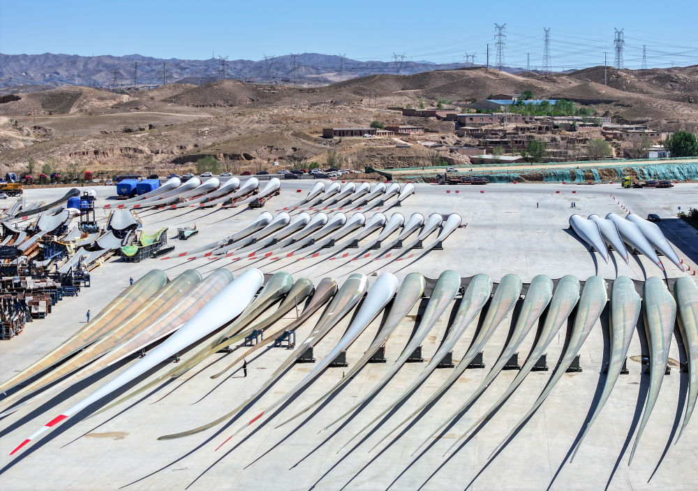 2024年5月11日拍攝的碼放在內(nèi)蒙古包頭市石拐區(qū)一家風(fēng)電設(shè)備制造企業(yè)廠區(qū)內(nèi)的葉片(無人機(jī)照片)。