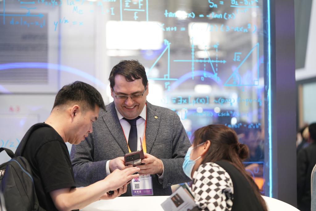 5月18日,在第八屆中俄博覽會展館內,參會者在進行商務交流。新華社記者 王松 攝