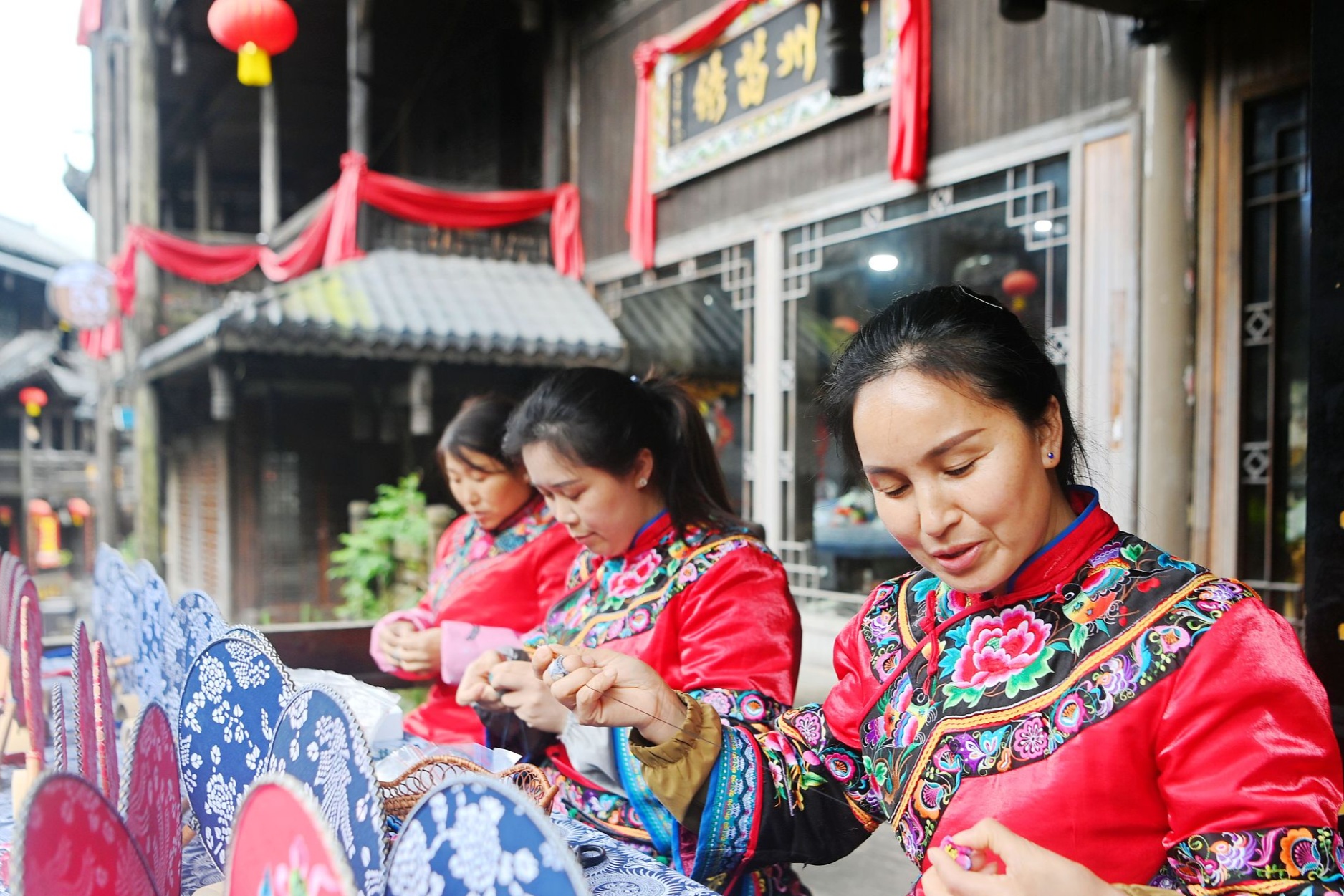 繡娘們給苗繡飾品穿線(xiàn)