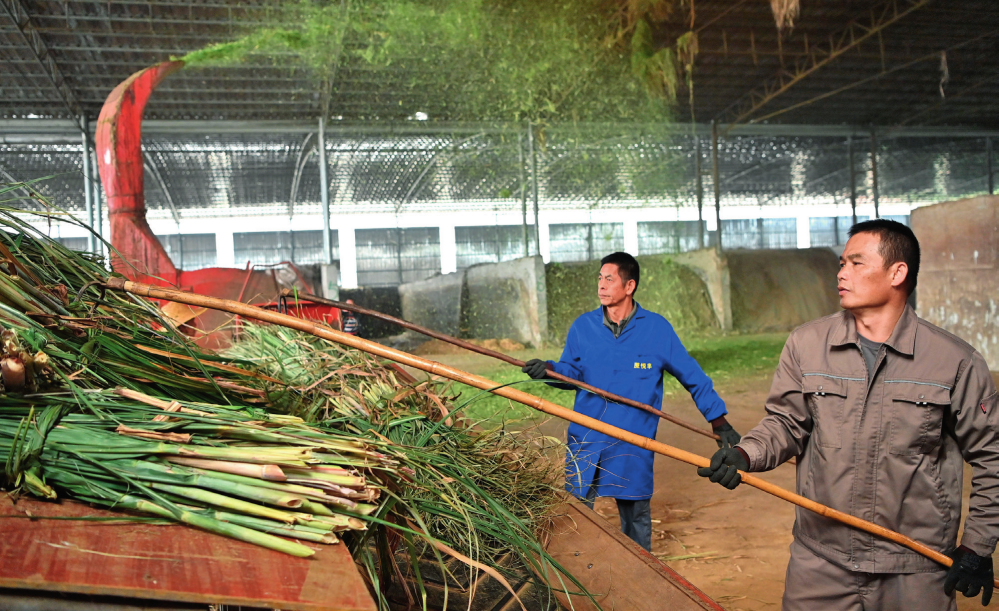 工作人員在廣西來(lái)賓市興賓區(qū)大灣鎮(zhèn)雙誠(chéng)牧業(yè)有限公司粉碎甘蔗尾葉,準(zhǔn)備制作牛飼料(2023年12月13日攝)周華攝