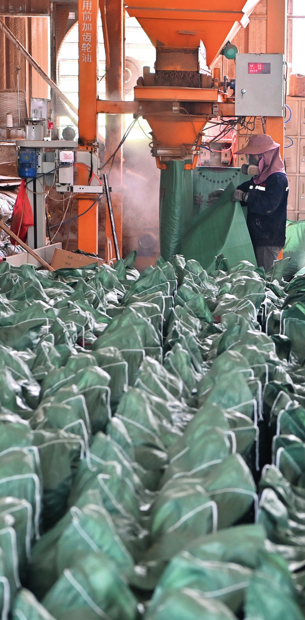 工作人員在廣西來(lái)賓小平陽(yáng)鎮(zhèn)一家飼料廠(chǎng)將甘蔗葉為主要原料的飼料裝袋(2023年12月12日攝)周華攝
