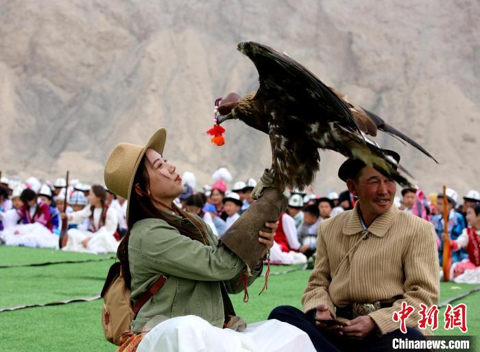 近日,2024年新疆阿合奇縣獵鷹文化旅游季拉開帷幕,游客現(xiàn)場(chǎng)與獵鷹互動(dòng)。陶拴科 攝