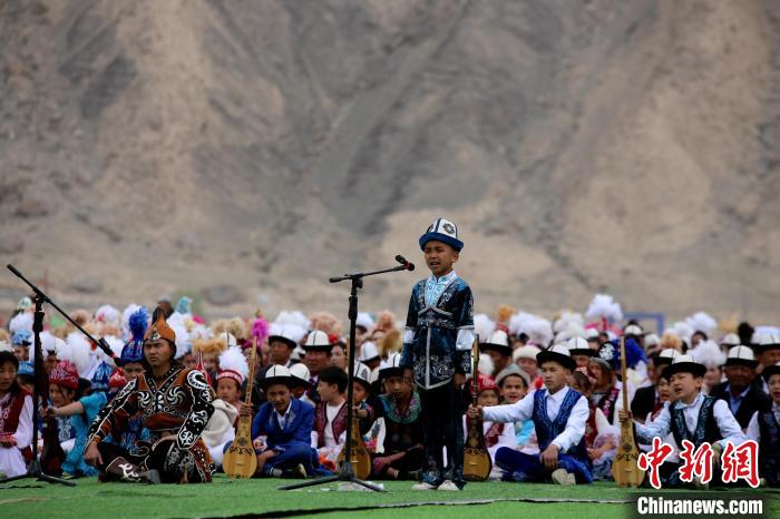 近日,2024年新疆阿合奇縣獵鷹文化旅游季拉開帷幕,現(xiàn)場(chǎng)小瑪納斯奇?zhèn)鞒腥藶橛^眾說唱《瑪納斯》。陶拴科 攝