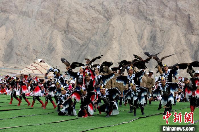 近日,2024年新疆阿合奇縣獵鷹文化旅游季拉開帷幕,活動(dòng)現(xiàn)場(chǎng)獵鷹手與舞蹈演員共同演繹獵鷹舞。陶拴科 攝