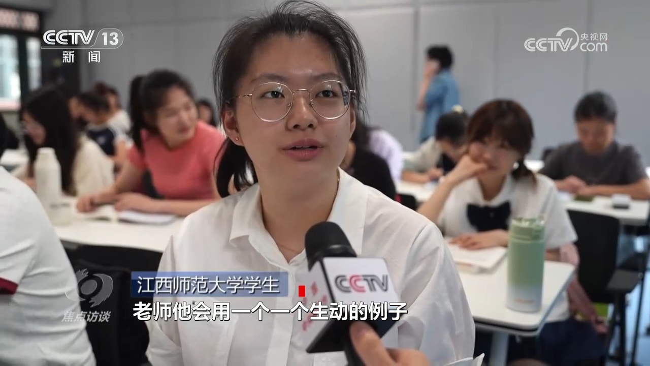 江西師范大學學生:“老師他會用一個生動的例子來表達他的觀點,然后也會用一些讓人感覺很熱血沸騰的,也有那種催人眼淚的故事,然后來激蕩我的心靈?!?/p>