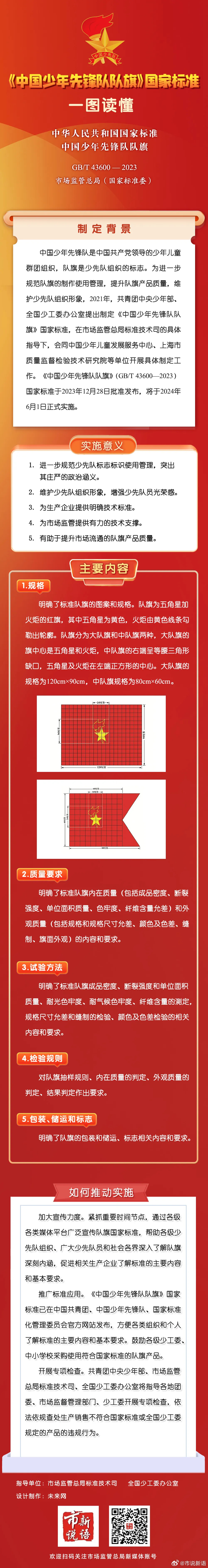 《中國(guó)少年先鋒隊(duì)隊(duì)旗》(GB/T 43600—2023)國(guó)家標(biāo)準(zhǔn)將于2024年6月1日正式實(shí)施。該標(biāo)準(zhǔn)由市場(chǎng)監(jiān)管總局(國(guó)家標(biāo)準(zhǔn)委)批準(zhǔn)發(fā)布,共青團(tuán)中央、全國(guó)少工委會(huì)同相關(guān)單位編制。