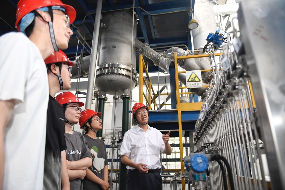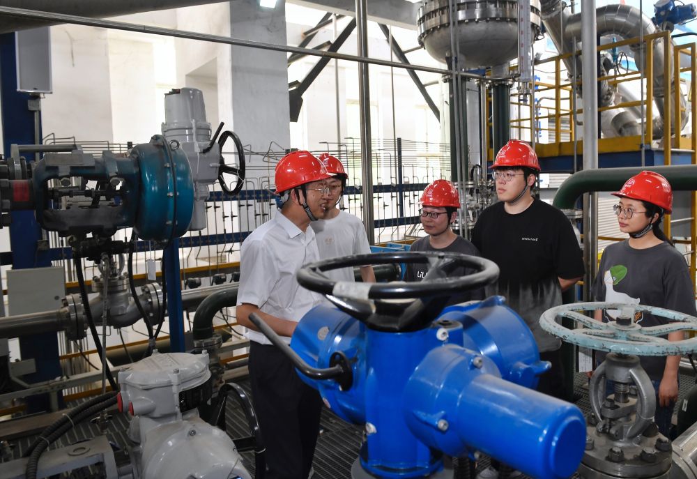 5月24日,在位于成都的中國核動力研究設(shè)計院內(nèi),鐘元章(右一)與團隊年輕人在試驗臺架上交流。