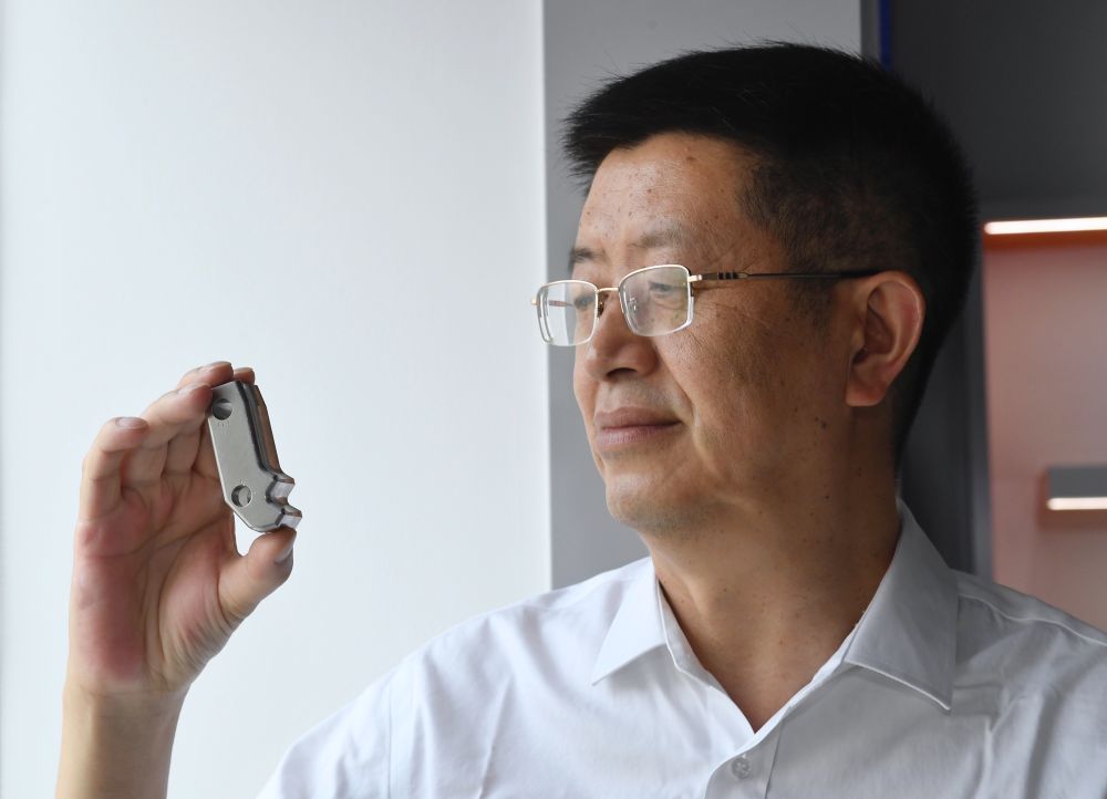 5月24日,在位于成都的中國核動力研究設(shè)計院內(nèi),鐘元章在展示通過3D打印的堆內(nèi)構(gòu)件堆芯圍筒。鐘元章介紹,通過3D打印的方式來生產(chǎn)“華龍一號”的零部件,是目前的一個研究方向。