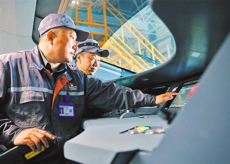 ?5月28日,中車長客首席操作師羅昭強(前一)在對新一批復(fù)興號智能動車組進行出廠前的質(zhì)量檢查。