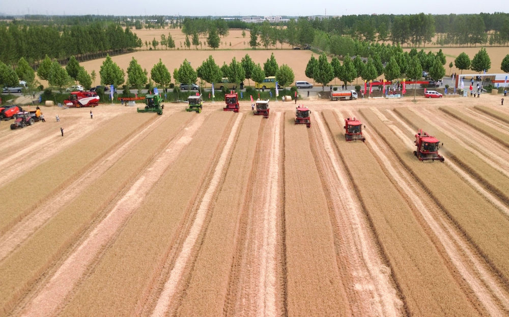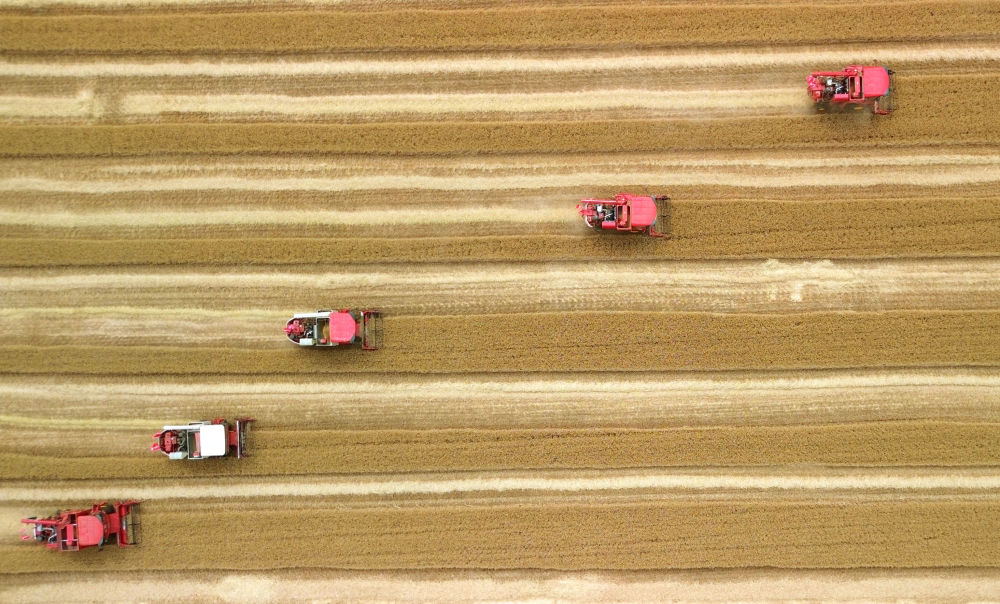 麥浪翻滾,沃野生金。麥田中,10臺收割機(jī)依次排開;一聲令下,農(nóng)機(jī)手駕駛收割機(jī)勻速前行,風(fēng)中搖曳的麥穗被吸入“腹中”,田間只剩下短短的麥茬。
