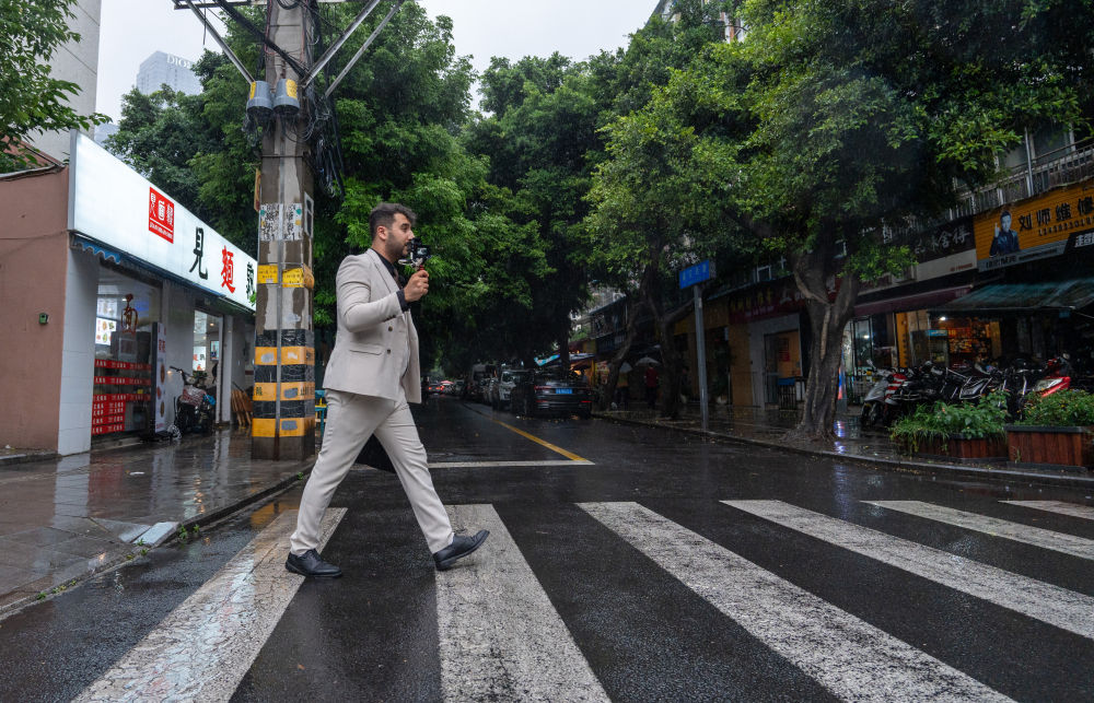5月28日,王立軒手持相機在成都街頭邊走邊拍。新華社記者 薛晨 攝