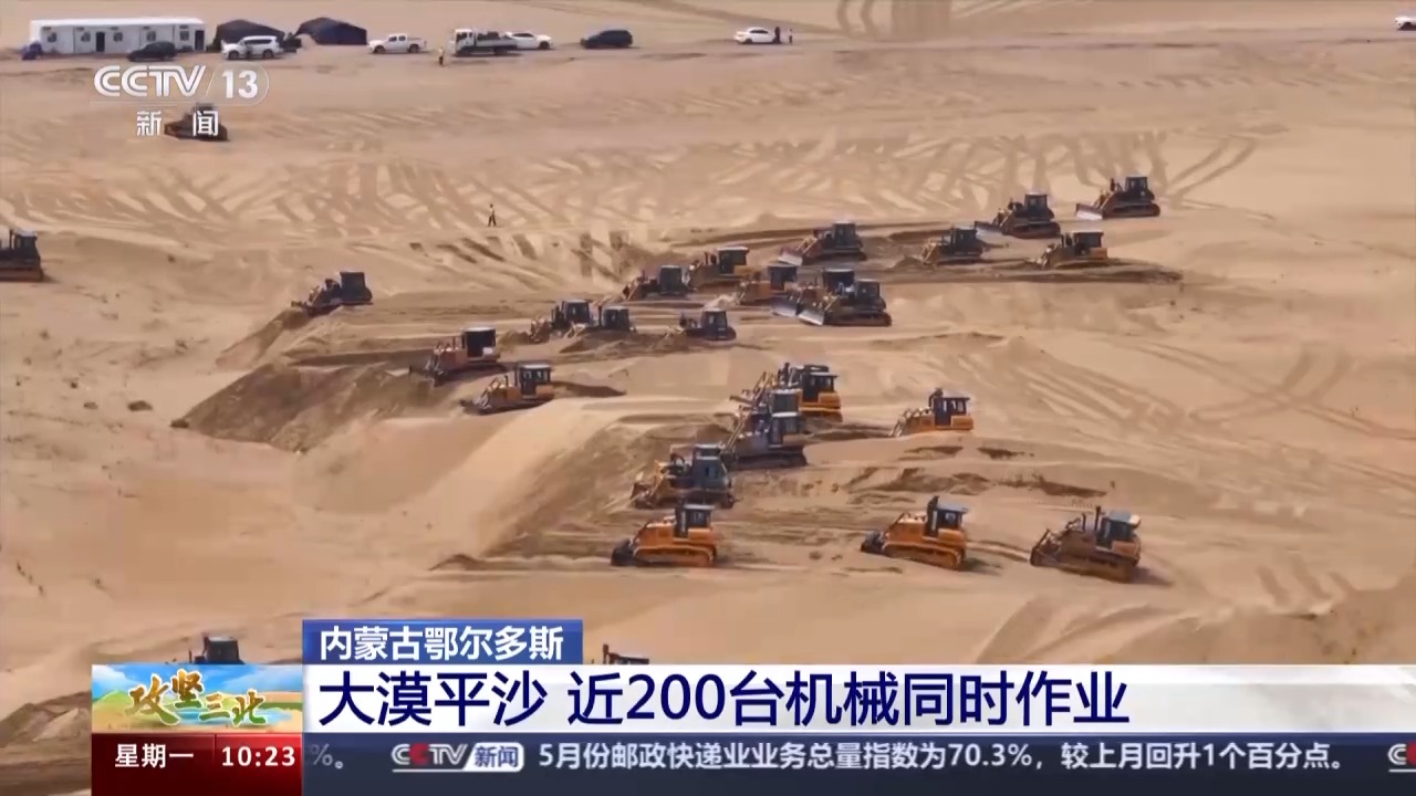 此刻,在我身后,近200臺推土機正在這片沙漠上來回穿行,他們要把這些高低起伏、連綿不斷的沙丘推平整了,再安裝光伏板。這么多推土機具體是如何作業(yè)的?技術人員告訴我們,因為地形的原因,今天現場的推平作業(yè)大致分為兩個梯隊:第一梯隊負責在沙丘的最上面,把頂部的沙子推下來;第二梯隊隨后,填平沙坑,平整現場。