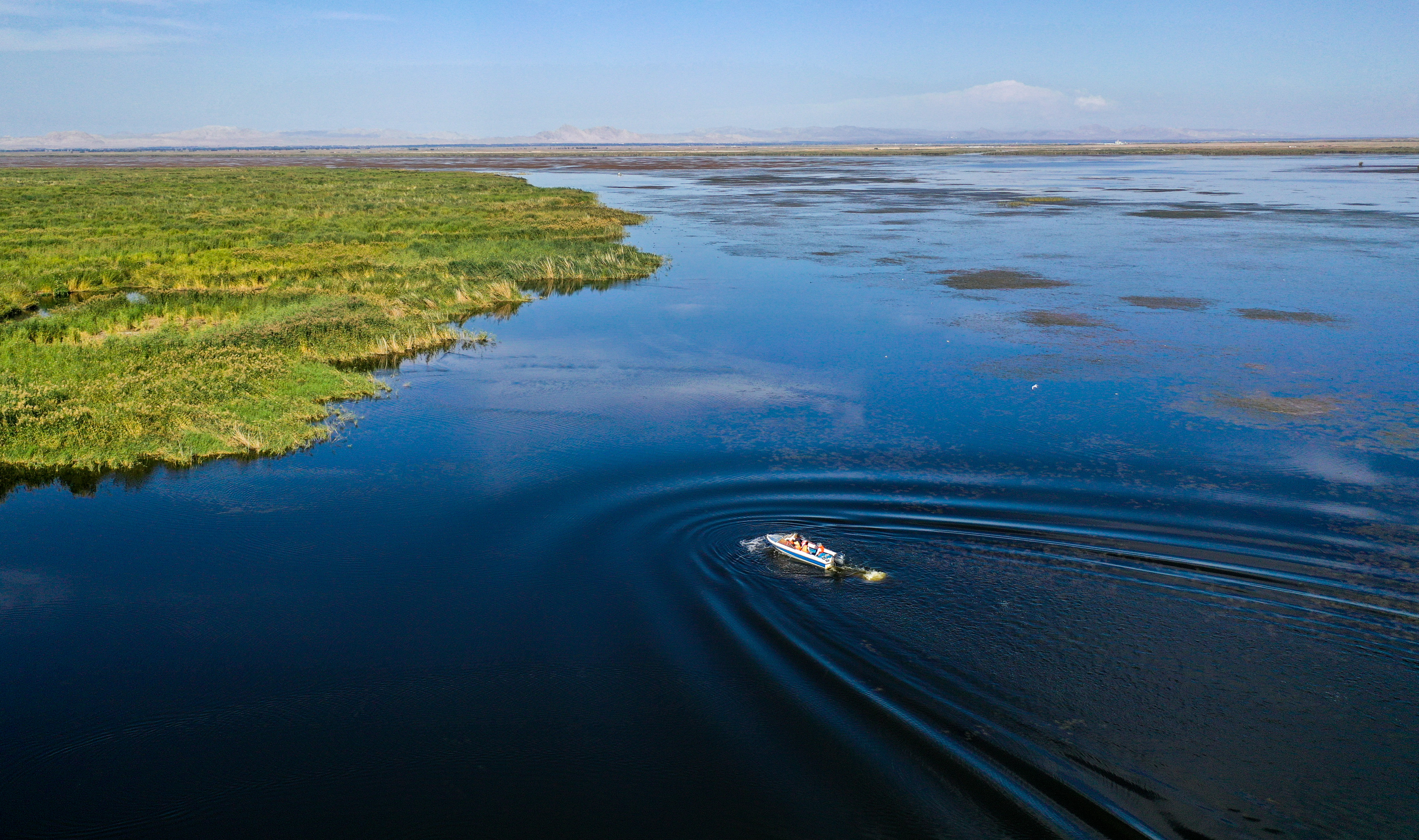 內(nèi)蒙古烏梁素海湖面上,河湖濕地水環(huán)境保護(hù)與修復(fù)技術(shù)研究團(tuán)隊(duì)成員乘坐快艇去采集湖水樣本(2023年9月15日攝,無人機(jī)照片)。新華社記者 連振 攝