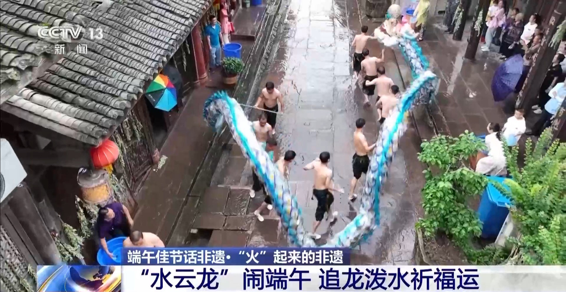 總臺(tái)記者 牟亮:我現(xiàn)在所在的位置就是重慶市銅梁區(qū)的安居古城,在我身后正在進(jìn)行端午節(jié)的非遺文化表演,這是水云龍的表演。10名赤膊的漢子正在舞動(dòng)一條18米的藍(lán)色水云龍,整條龍上下翻騰,左右騰挪,在兩邊明清時(shí)期的老屋之間穿行。而站在兩旁的居民和游客,會(huì)拿著水瓢或者水盆,將清水潑向正在舞動(dòng)的水云龍。雖然水云龍所到之處,大家衣衫都可能打濕,但是大家都樂在其中。