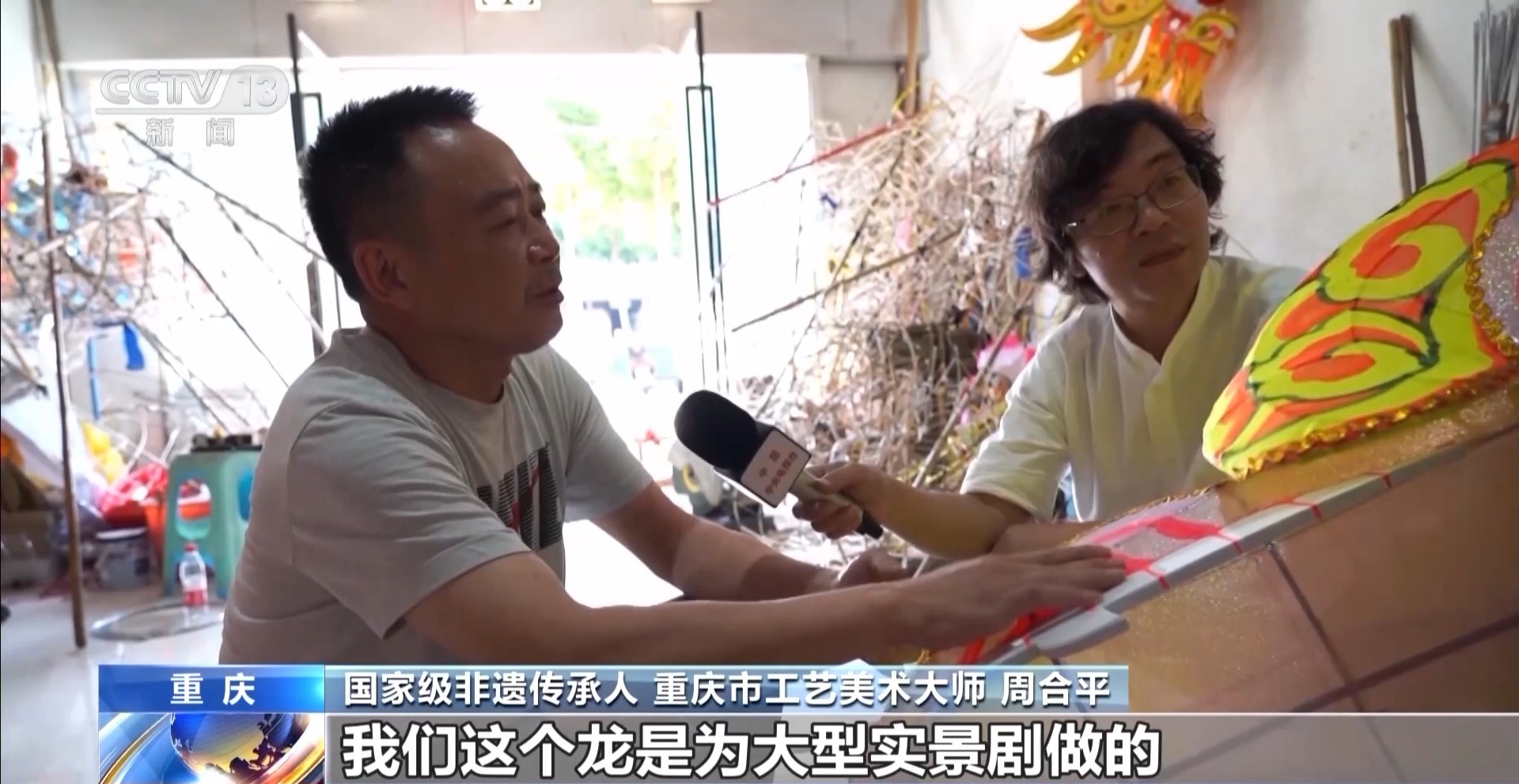 國家級(jí)非遺傳承人 重慶市工藝美術(shù)大師 周合平:我們這個(gè)龍是為大型實(shí)景劇做的,是一種夜光絨材質(zhì),是熒光色。