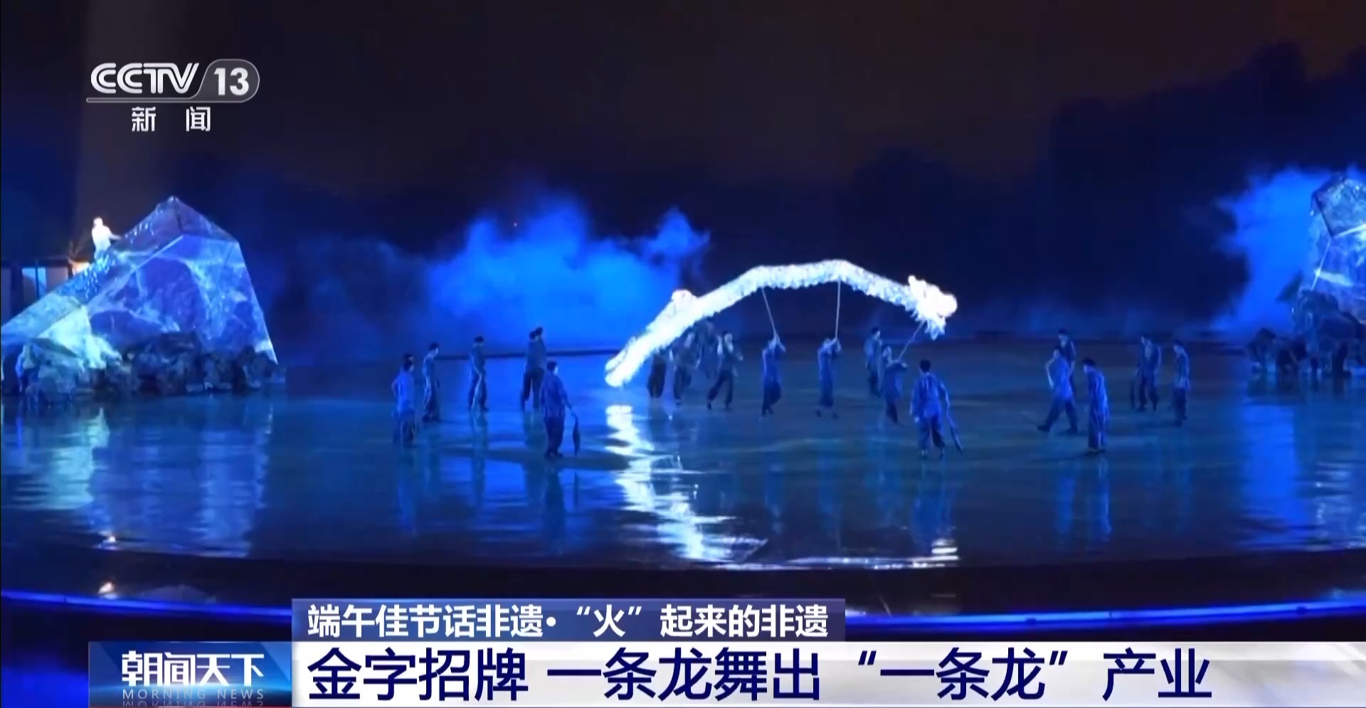 非遺的核心技藝在生產(chǎn)實(shí)踐中得到傳承。眼下,光是龍燈扎制業(yè)務(wù),已經(jīng)遍布全國十幾個(gè)省份,平均每年訂單超過1000萬元。如今,扎制好的龍燈,更多是被用在當(dāng)?shù)氐凝埼璞硌萆?。這是大型非遺山水實(shí)景劇《追夢(mèng) 銅梁龍》的演出現(xiàn)場(chǎng),觀眾可以看到水云龍、荷花龍等十幾種銅梁傳統(tǒng)龍舞,其中壓軸戲,便是銅梁火龍。