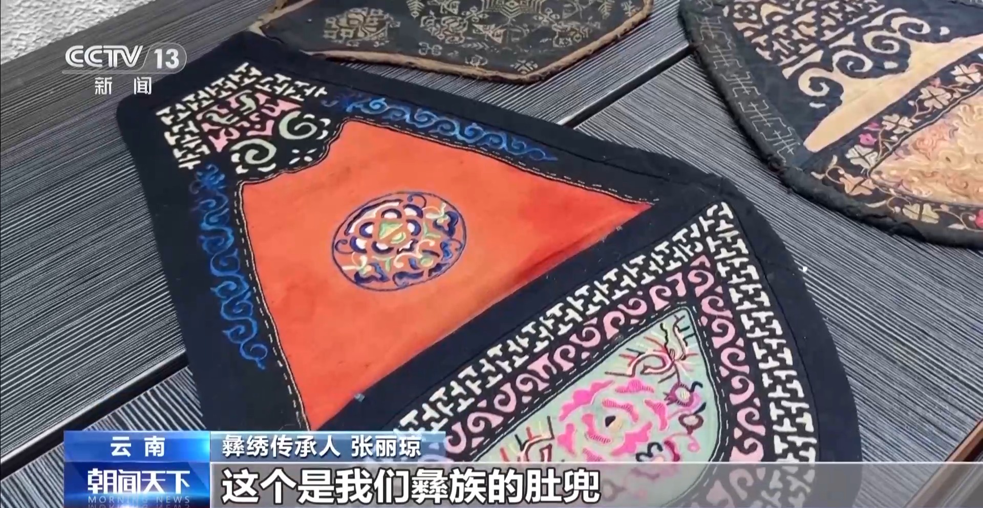 彝繡傳承人 張麗瓊:這個(gè)是我們彝族的肚兜,是彝族小姑娘送給彝族小伙子的定情物。它上面有很多現(xiàn)在已經(jīng)失傳的刺繡針法,像貼布繡、長針繡、平針繡。