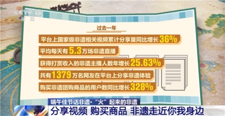 社交媒體平臺(tái)近日發(fā)布的《2024非遺數(shù)據(jù)報(bào)告》顯示,過去一年,平臺(tái)上國家級(jí)非遺相關(guān)視頻累計(jì)分享量同比增長36%,平均每天有5.3萬場(chǎng)非遺直播,獲得打賞收入的非遺主播人數(shù)年增長25.63%,共有1379萬名網(wǎng)友在平臺(tái)上分享非遺體驗(yàn),購買非遺團(tuán)購商品的用戶數(shù)同比增長328%。 某購物平臺(tái)數(shù)據(jù)顯示,今年前三季度,以“非遺”為關(guān)鍵詞的搜索量同比增長168%,“非遺”主題相關(guān)的團(tuán)購訂單量同比提升245%。