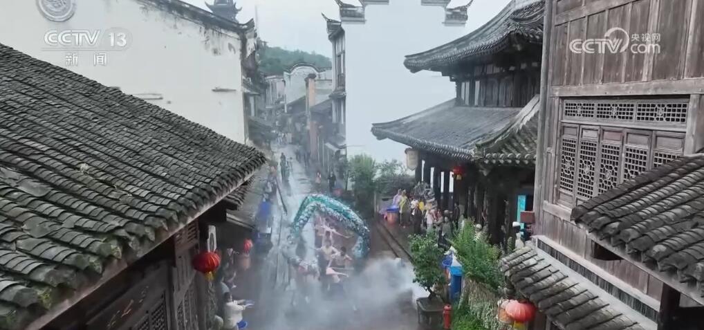 重慶市銅梁區(qū)的安居古城正在進(jìn)行端午節(jié)的非遺文化表演——水云龍。10名赤膊的漢子舞動著一條18米的藍(lán)色水云龍,整條龍上下翻騰、左右騰挪,在兩邊明清時期的老屋之間穿行。而站在兩旁的居民和游客會拿著水瓢或者水盆,將清水潑向正在舞動的水云龍。雖然水云龍所到之處,大家衣衫都可能打濕,但是大家都樂在其中。