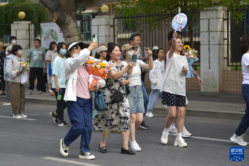 6月8日,在河南省焦作市博愛縣第一中學(xué)考點(diǎn),家長為走出考場的孩子送上鮮花。新華社發(fā)(程全攝)