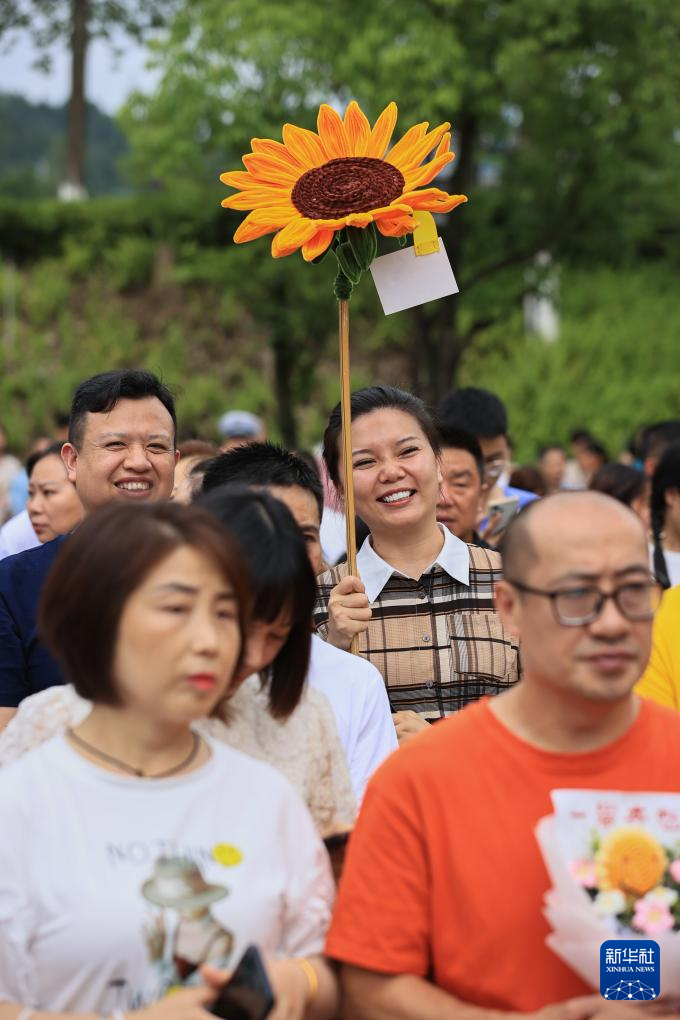 6月8日,在四川遂寧涪江中學(xué)考點(diǎn),家長手拿寓意“一舉奪魁”的向日葵迎接考生。新華社發(fā)(劉昌松攝)