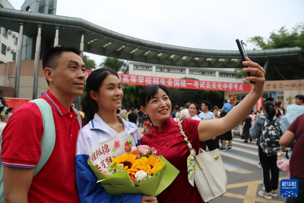 6月8日,在云南省水富市云天化中學(xué)考點(diǎn),家長和考生合影。新華社發(fā)(狄廷秀攝)