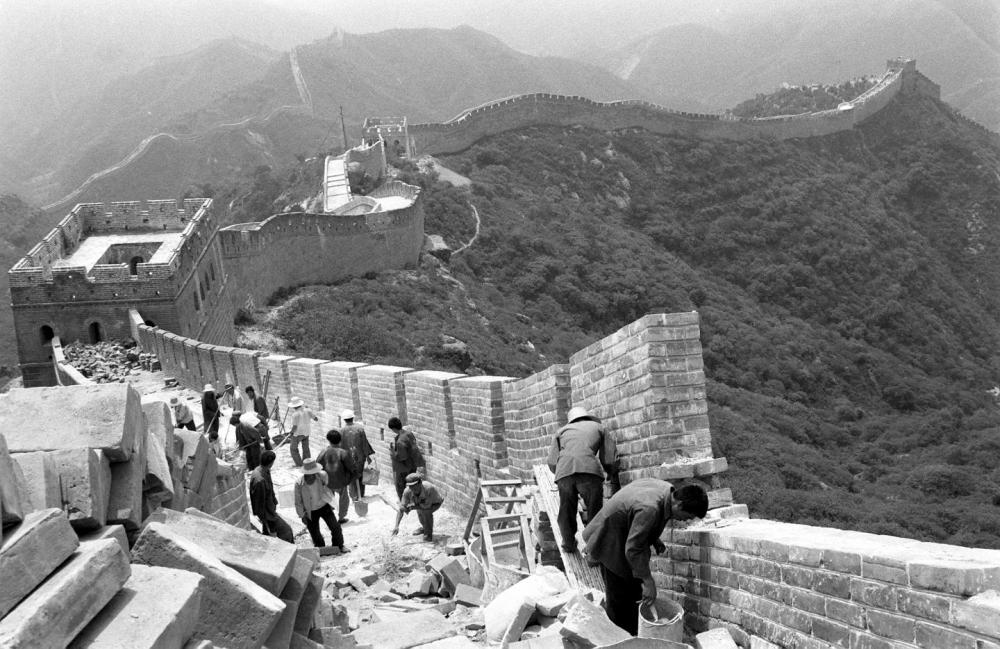 工人正在修復(fù)北京八達(dá)嶺長城的一段城墻。這是用由北京晚報、八達(dá)嶺特區(qū)辦事處等單位聯(lián)合發(fā)起“愛我中華 修我長城”社會贊助活動所獲款項進(jìn)行修復(fù)的第一期工程 (資料照片,1984年8月11日發(fā))。新華社記者 袁汝遜 攝