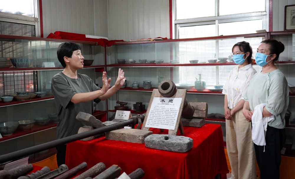 在秦皇島市海港區(qū)的長城文化展館,長城保護(hù)員李翠(左一)向游客介紹長城文化知識(2021年7月8日攝)。新華社記者 金皓原 攝