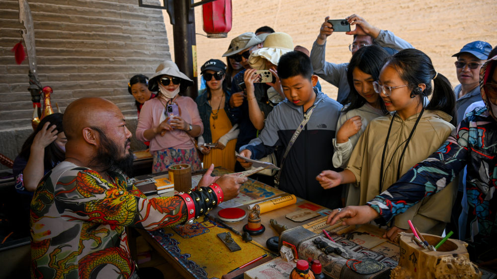 在甘肅嘉峪關(guān)關(guān)城景區(qū),網(wǎng)紅“關(guān)長”李森(左)為游客奉上自己手寫好的文創(chuàng)產(chǎn)品“關(guān)照”(2023年7月14日攝)。新華社記者 劉金海 攝