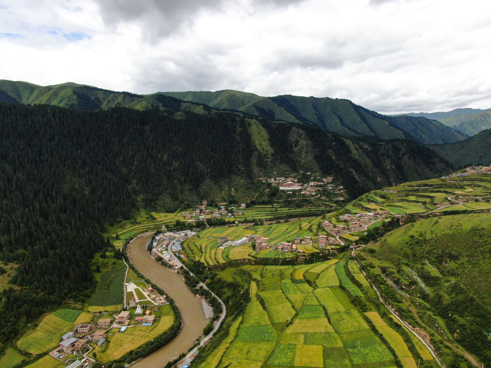 青海省果洛藏族自治州班瑪縣境內(nèi)拍攝的村莊景色(2021年8月7日攝,無人機(jī)照片)。