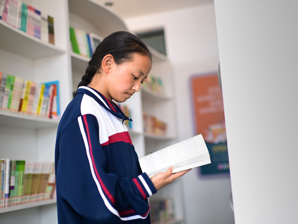 6月18日,果洛西寧民族中學(xué)學(xué)生尼東拉毛在圖書室看書。