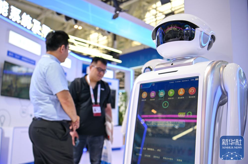 6月21日,與會者在博覽會現(xiàn)場咨詢了解一款適用于醫(yī)療場景的導(dǎo)診機(jī)器人。