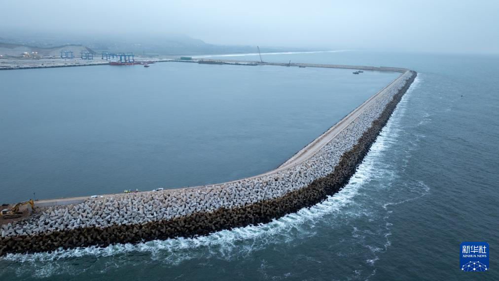 由中企控股和投資開發(fā)的錢凱港位于秘魯首都利馬以北的錢凱灣內(nèi)。從空中俯瞰,約2.6公里長(zhǎng)的防波堤像巨臂一般環(huán)抱住碼頭設(shè)施,以阻擋太平洋海浪的侵蝕。