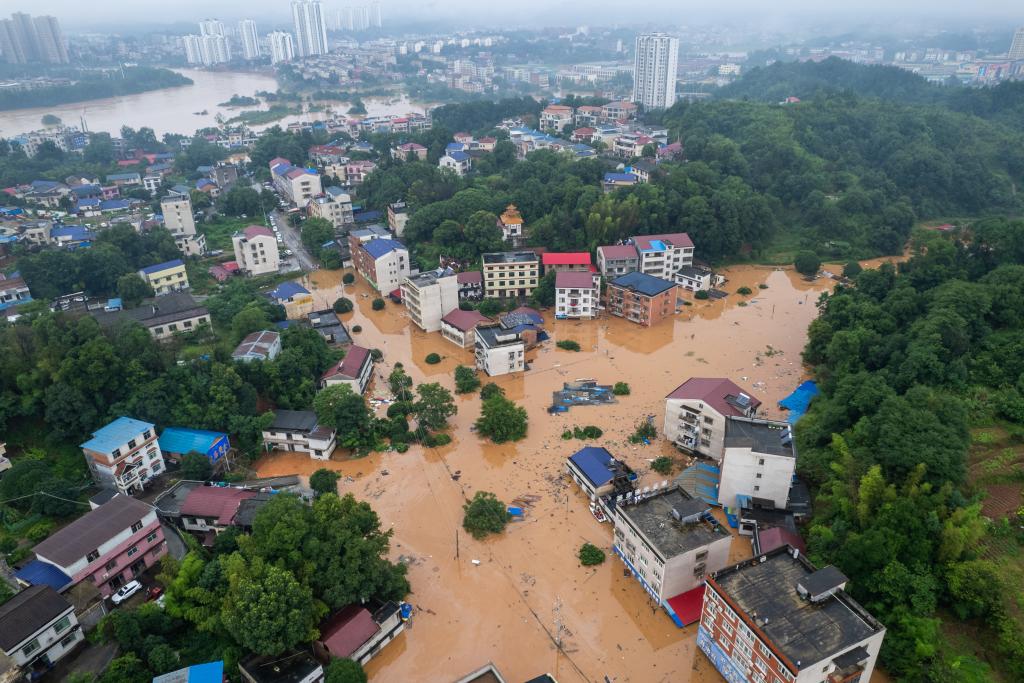這是7月1日在平江縣天岳街道大西村拍攝的被淹現(xiàn)場(無人機(jī)照片)。新華社記者 陳思汗 攝