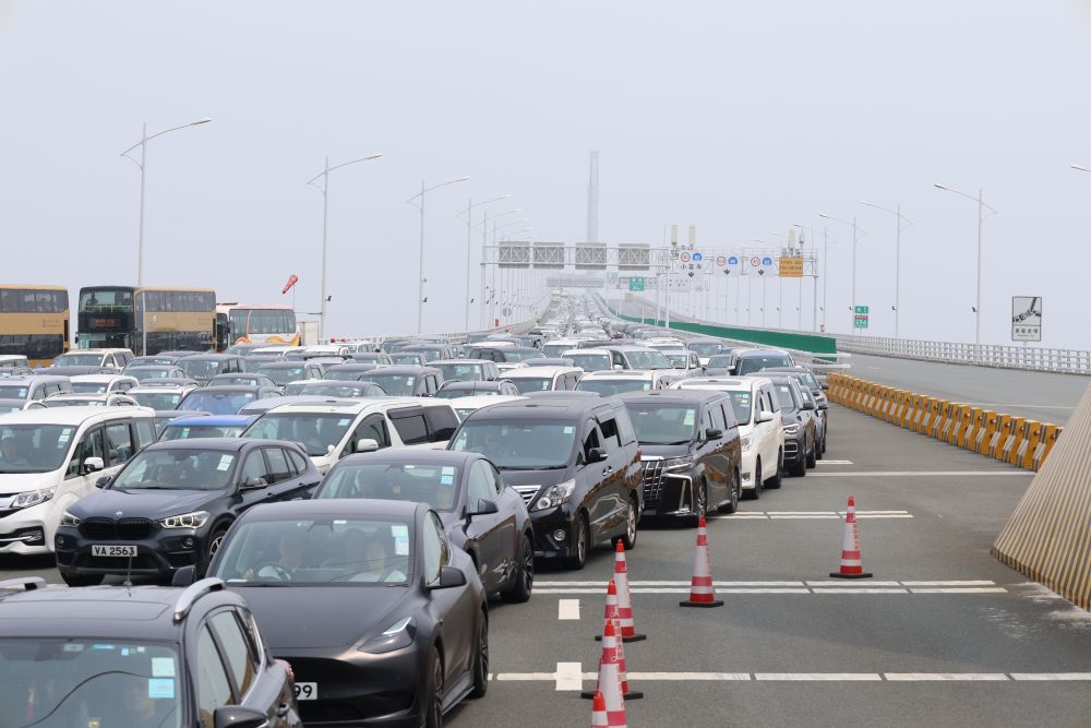 2024年4月6日在港珠澳大橋橋頭拍攝的等待入境的車輛。新華社發(fā)(王相國(guó) 攝)