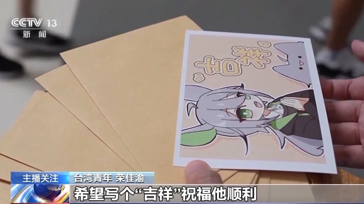 臺灣青年 榮佳渝:他跟我在介紹一些瓷器之類的,可以源源不斷在那邊講,我就覺得好厲害,當(dāng)然也會希望繼續(xù)跟他交流,因?yàn)榭ㄆ潜容^有心意的東西,我就想自己手畫交給對方,寫個“吉祥”祝福他順利。