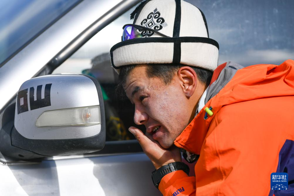7月4日,登山隊(duì)伍即將出發(fā)上山,塔西巴伊對(duì)著汽車后視鏡涂抹防曬霜。新華社記者 胡虎虎 攝