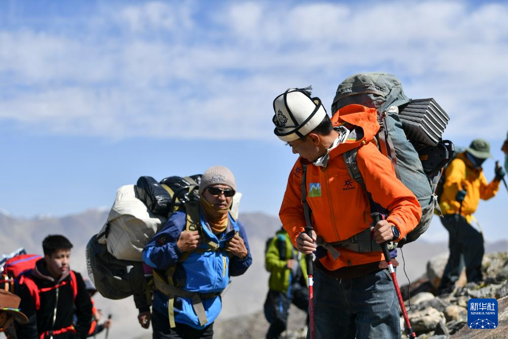 7月4日,塔西巴伊(左二)背著約25公斤的物品和同伴一起行進(jìn)在慕士塔格峰的山坡上。新華社記者 胡虎虎 攝