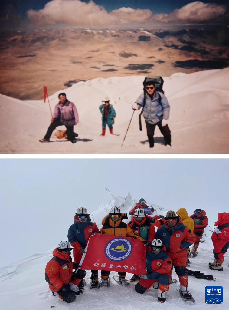 拼版照片:上圖為父親加尼拜克(左)與其兄弟于2004年8月6日一起為國(guó)外登山隊(duì)服務(wù)時(shí)在慕士塔格峰上的合影(2024年7月5日翻拍資料照片,新華社記者胡虎虎攝);下圖為兒子塔西巴伊(左三、黃衣者)和同伴于2023年7月29日登頂慕士塔格峰時(shí)的合影(受訪者供圖)。新華社發(fā)