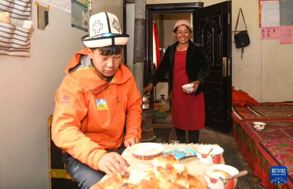 7月5日,塔西巴伊下山后回到家,母親為他準(zhǔn)備了奶茶、馕、酸奶等美食。新華社記者 胡虎虎 攝