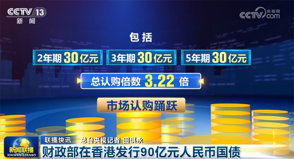 財政部7月10日在香港招標發(fā)行2024年第三期人民幣國債,發(fā)行規(guī)模為90億元,包括2年期、3年期、5年期各30億元??傉J購倍數(shù)3.22倍,市場認購踴躍。今年財政部在香港計劃發(fā)行550億元人民幣國債,進一步完善常態(tài)化發(fā)行機制,支持鞏固提升香港國際金融中心地位。